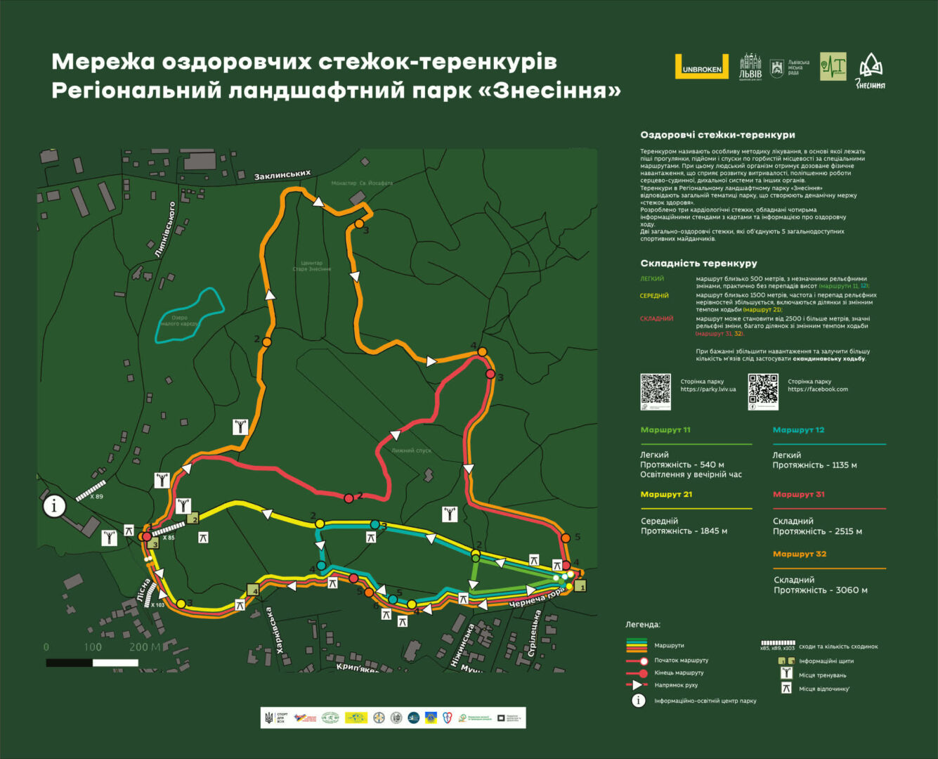 Любителям активного способу життя буде цікавою Стежка здоров’я, що пролягає територією ландшафтного парку. По всій території стежки є вказівники та можливість для руху велосипедистів. Також вона включає в себе спортивний майданчик, обладнаний необхідним інвентарем. Ще одна спортивна атракція Знесіння – мотузковий парк “Лазанка”, розташований на центральній алеї. А для тих, хто прагне влаштувати пікнік на природі, тут є водойма з невеличким пляжем, альтанками і облаштованими місцями для розпалювання багаття.